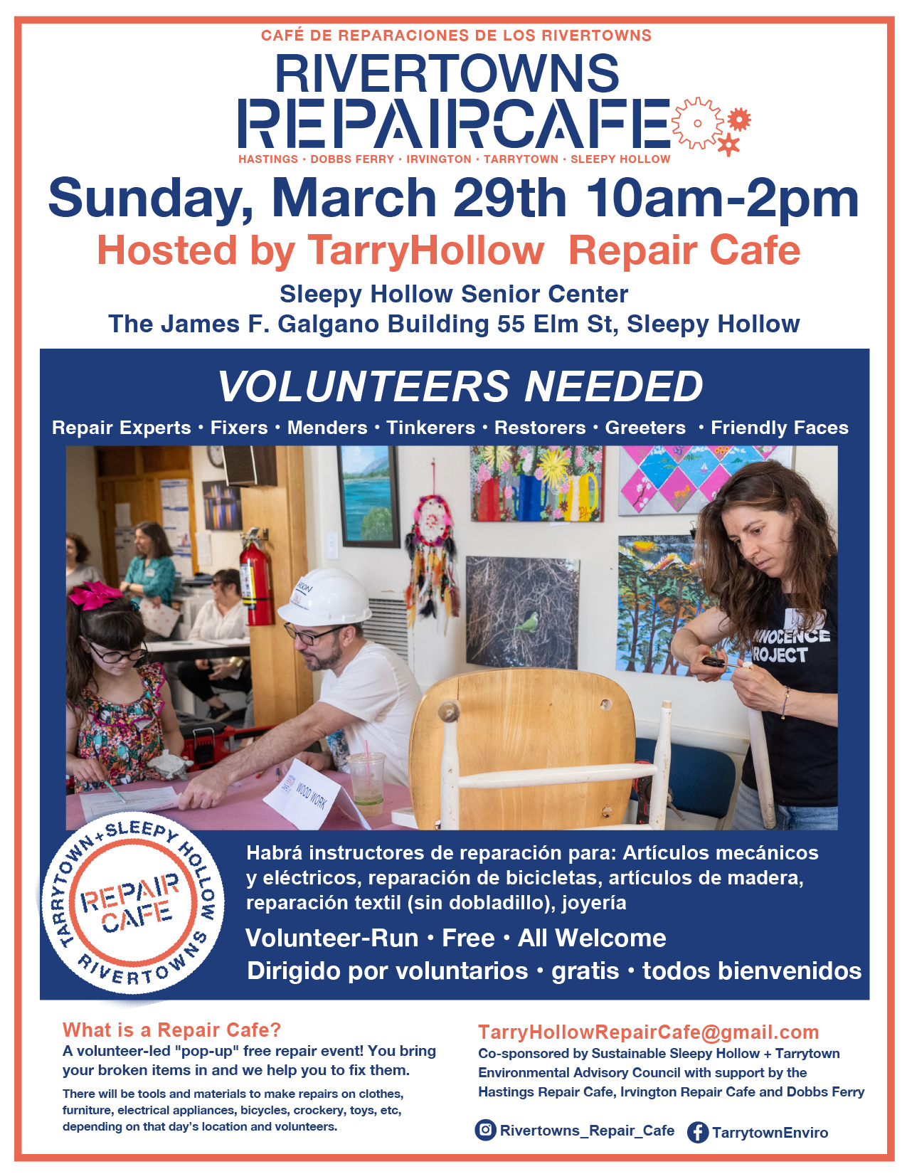 TarryHollow Repair Cafe – March 29, 2026 March 29 @ 10:00 am - 2:00 pm Sleepy Hollow Senior Center 55 Elm St, Sleepy Hollow, United States SAVE THE DATE: Saturday, March 29th 10am-2pm - Sleepy Hollow Senior Center, 55 Elm St.